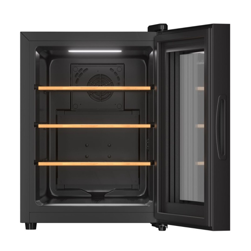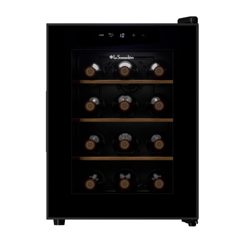 Fristående vinkyl/serveringskyl från franska La Sommelière med kapacitet för upp till 12 flaskor (Bordeaux). Snygg design och kompakt storlek gör det enkelt att hitta en plats för det i ditt hem! Vinkylen är utrustad med UV-skyddad glasdörr och integrerad pekskärm i dörren. Vinkylen har 3 ståltrådshyllor med träfronter och kallvitt LED-ljus. Den eleganta designen i svart och antracitgrått passar sömlöst i moderna miljöer.