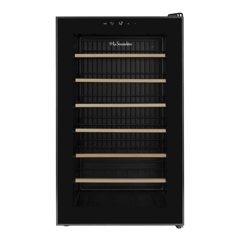 Snygg design och kompakt storlek gör det enkelt att hitta en plats för det i ditt hem! Vinkylen är utrustad med UV-skyddad glasdörr och integrerad pekskärm i dörren. Vinkylen har 5 ståltrådshyllor med träfronter och kallvitt LED-ljus. Den eleganta designen i svart och antracitgrått passar sömlöst i moderna miljöer.