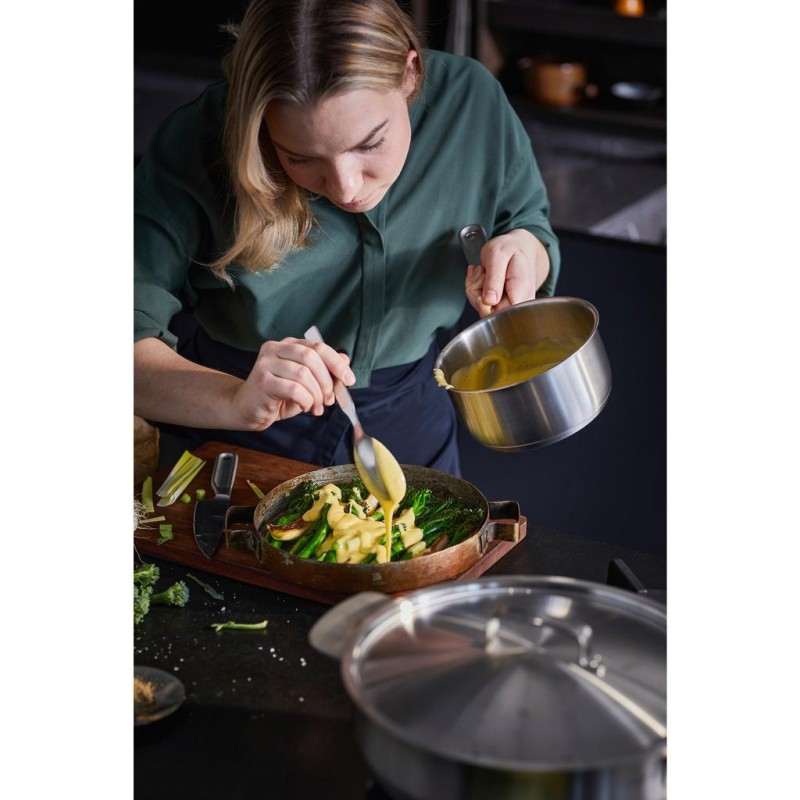 Den är extremt hållbar och har tillverkats av 90 % återvunnet stål som har 92 % lägre koldioxidavtryck än branschgenomsnittet. Den tjocka 3-lagersbotten ger effektiv och jämn uppvärmning på alla hällar och hjälper dig att lyckas med din matlagning.