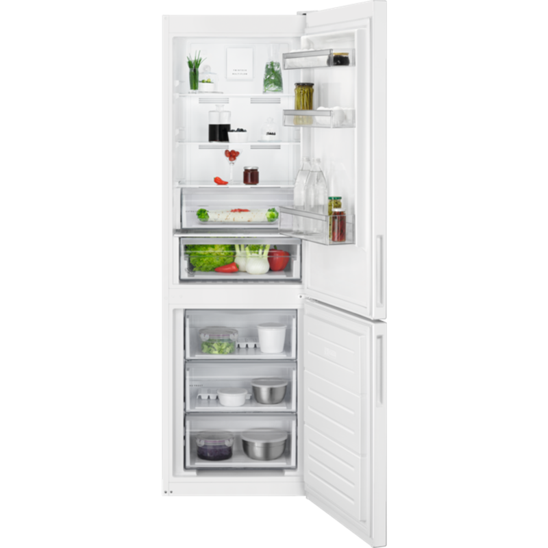 TwinTech®, Energiklass: E, Ljudnivå: 38 dB(A), Ljudklass: C, Kyl/Frys nettovolym: 230/101 l, MultiFlow, NoFrost, CoolMatic, Kontroll och temperaturvisning: Touch electronic control, Invändigt, Kompressorer/Termostater: 1K/2T, Mått (HxBxD)(mm): 1860x595x650, Färg: Vit, Flat Door, Höger och omhängbar