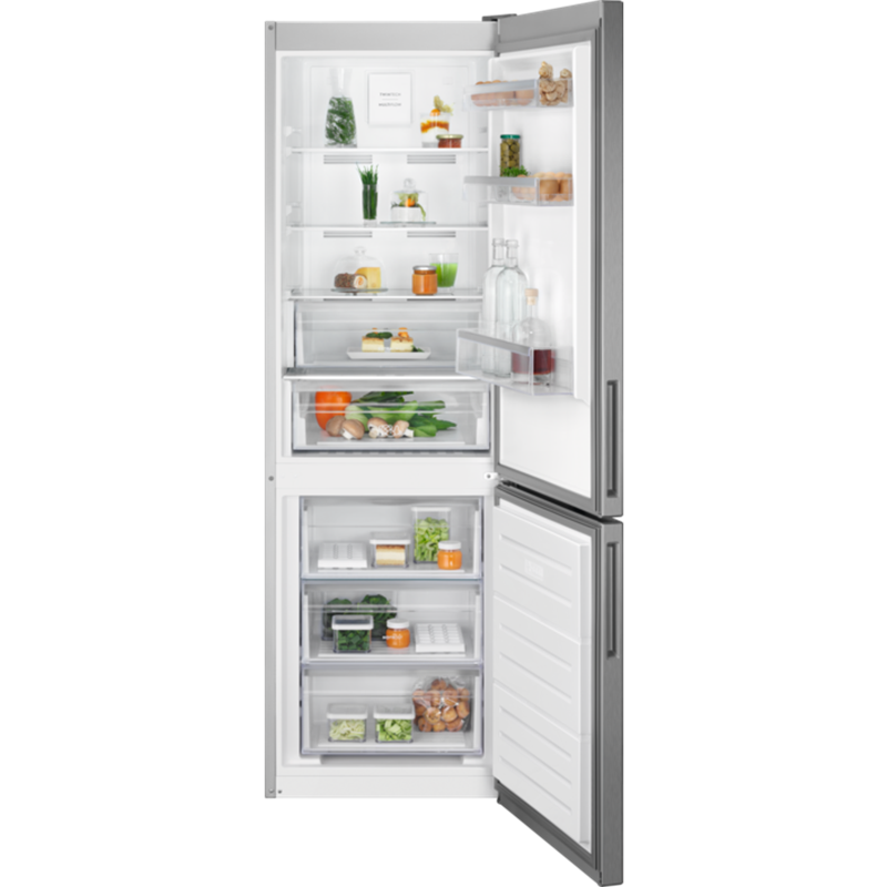 TwinTech®, Energiklass: E, Ljudnivå: 38 dB(A), Ljudklass: C, Kyl/Frys nettovolym: 230/101 l, MultiFlow, NoFrost, Shoppingläge, Kontroll och temperaturvisning: Touch electronic control, Invändigt, Kompressorer/Termostater: 1K/2T, Mått (HxBxD)(mm): 1860x595x650, Färg: Grå m rostfri look och AntiFingerPrint, Flat Door, Höger och omhängbar