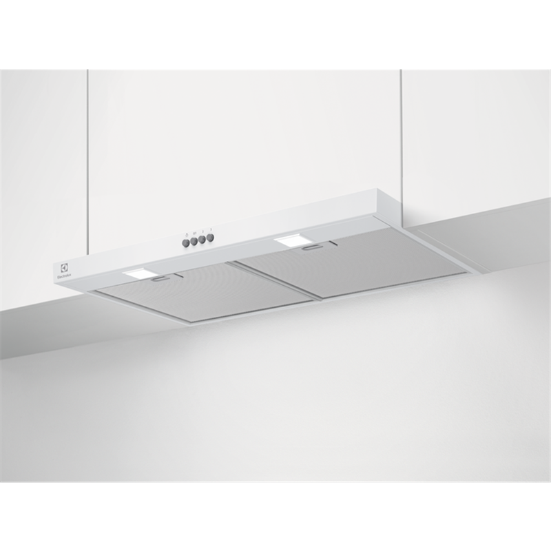 70 cm Inbyggbar fläkt, Energieffektivitet: C, Flödeseffektivitet: C, Belysningeffektivitet: A, Fettfilterseffektivitet: D, Tryckknappar, Antal effektlägen: 3, Effekt min/max/intensiv: 165/420/- m³/h, Ljudnivå min/max/intensiv: 44/62/- db(A), Aktivt kolfilter: Tillbehör, MCFB71, 902980281, Superkolfilter (tillval): MCFB75, 902980302, Belysning (Antal och typ): 2, LED Spotlight, Mått (BxD)(mm): 698x470. Färg: Vit