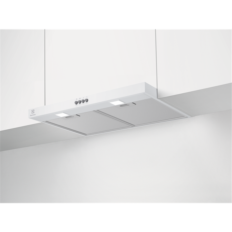 60 cm Inbyggbar fläkt, Energieffektivitet: C, Flödeseffektivitet: C, Belysningeffektivitet: A, Fettfilterseffektivitet: D, Tryckknappar, Antal effektlägen: 3, Effekt min/max/intensiv: 165/420/- m³/h, Ljudnivå min/max/intensiv: 44/62/- db(A), Aktivt kolfilter: Tillbehör, MCFB71, 902980281, Superkolfilter (tillval): MCFB75, 902980302, Belysning (Antal och typ): 2, LED Spotlight, Mått (BxD)(mm): 598x470. Färg: Vit