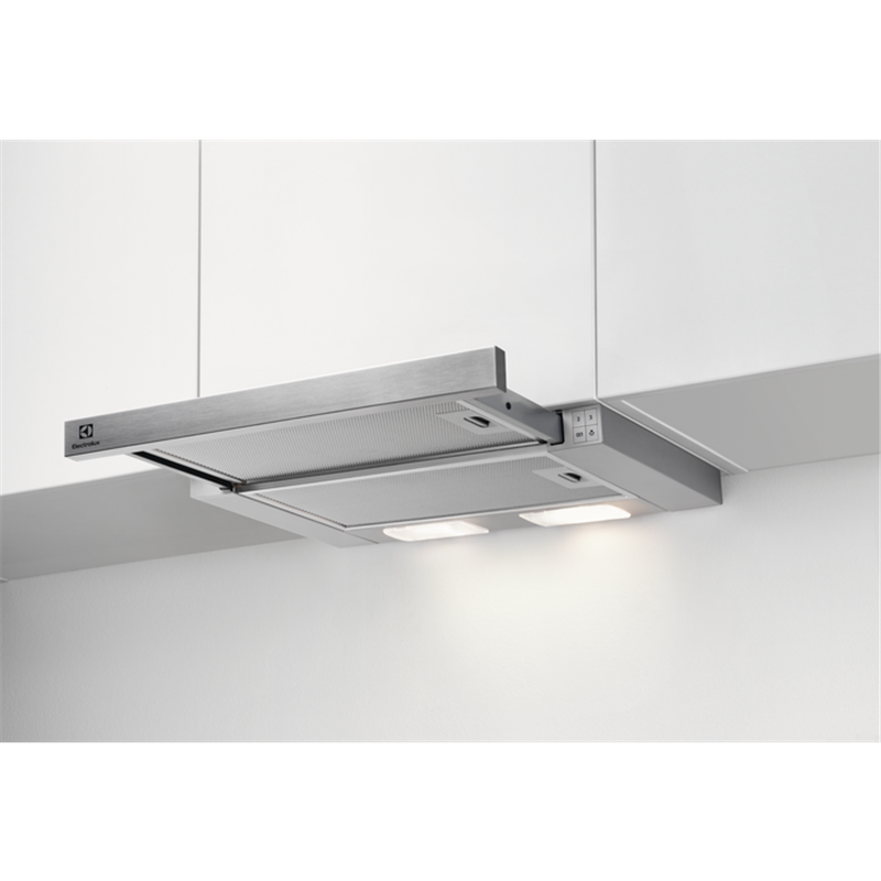 50 cm Utdragbar fläkt, Energieffektivitet: C, Flödeseffektivitet: D, Belysningeffektivitet: E, Fettfilterseffektivitet: D, mekaniska tryckknappar, Antal effektlägen: 3, Micro switch, Effekt max/min: 410/170 m³/h, Ljudnivå max/min: 69/48 db(A), Aktivt kolfilter: 2, Tillbehör, ECFB03, 902 979 880, Belysning (Antal och typ): 2, Glödlampa LED, Mått (BxD)(mm): 498x284. Färg: Silver
