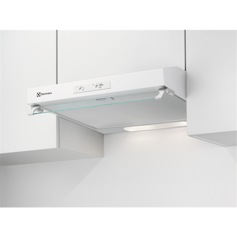 Traditionell underbyggd fläkt, 60cm, Energi: D, Effektivitet: E, Belysning: D, Filter: B, Ljudnivå: 73 dB(A), Max kapacitet: 336 m3/h, Mekanisk sliderkontroll, Färg: Vit
